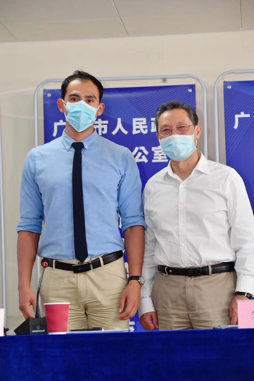陈志远在广州市政府第78场疫情防控新闻采访活动中与钟南山院士合影