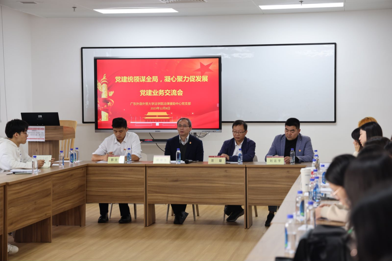 为深入学习贯彻习近平法治思想,探索新形势下党建与普法的新路径,12月8日上午,广东外语外贸大学法学院法律援助中心党支部(以下简称法援党支部)在知识城校区开展“强信念,跟党走,开创法援工作新局面”主题党日活动。法学院党委书记杨敏生、副书记范聪以及法援党支部全体师生党员参加了活动。本次活动由范聪主持。
